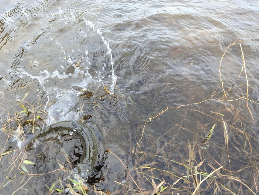 東側のアウトレット付近はあまり魚がいなそう。真ん中の網の仕切り付近に人が多く、大物も多いようです。西側のインレット付近も結構魚がいるみたいでフライの人が多いです。