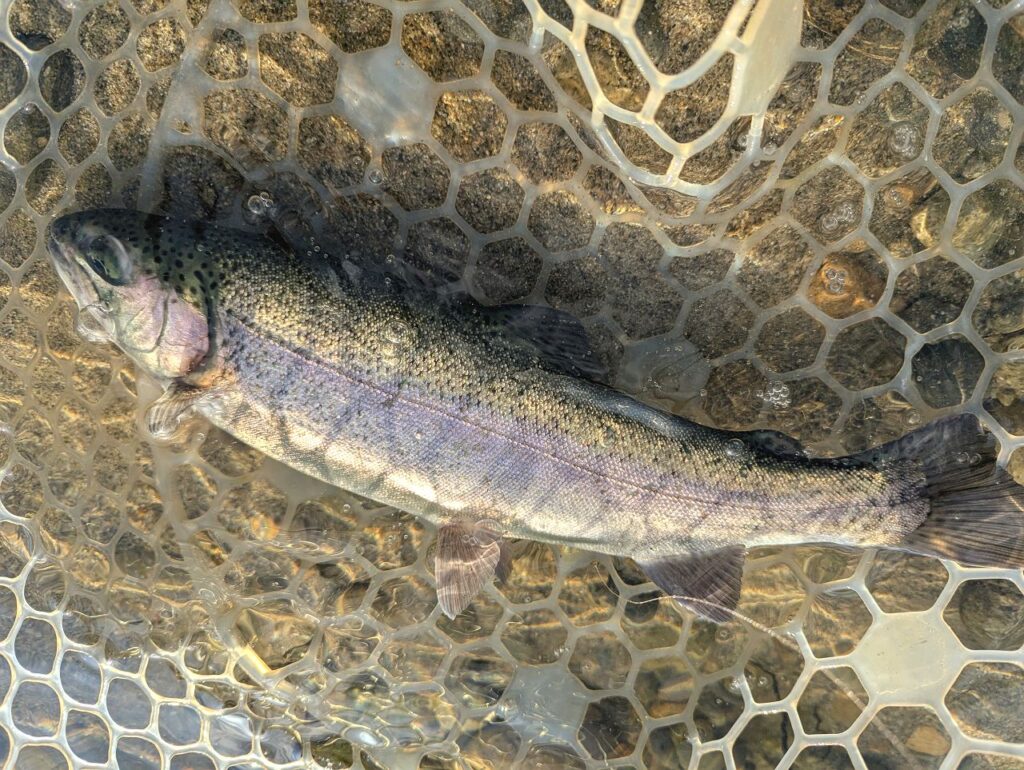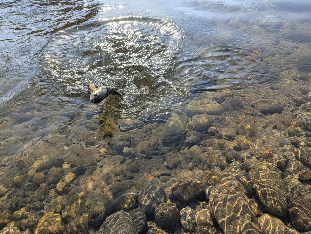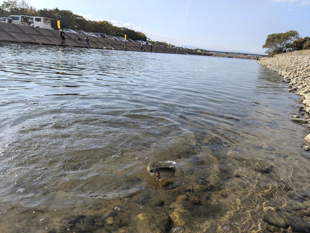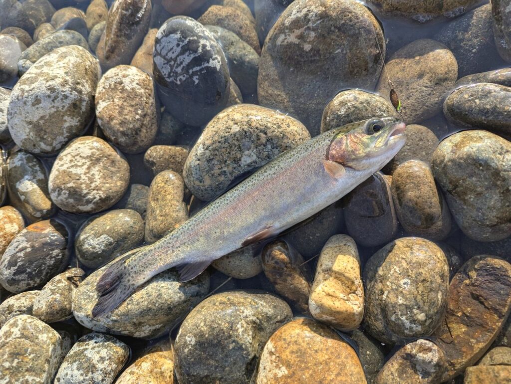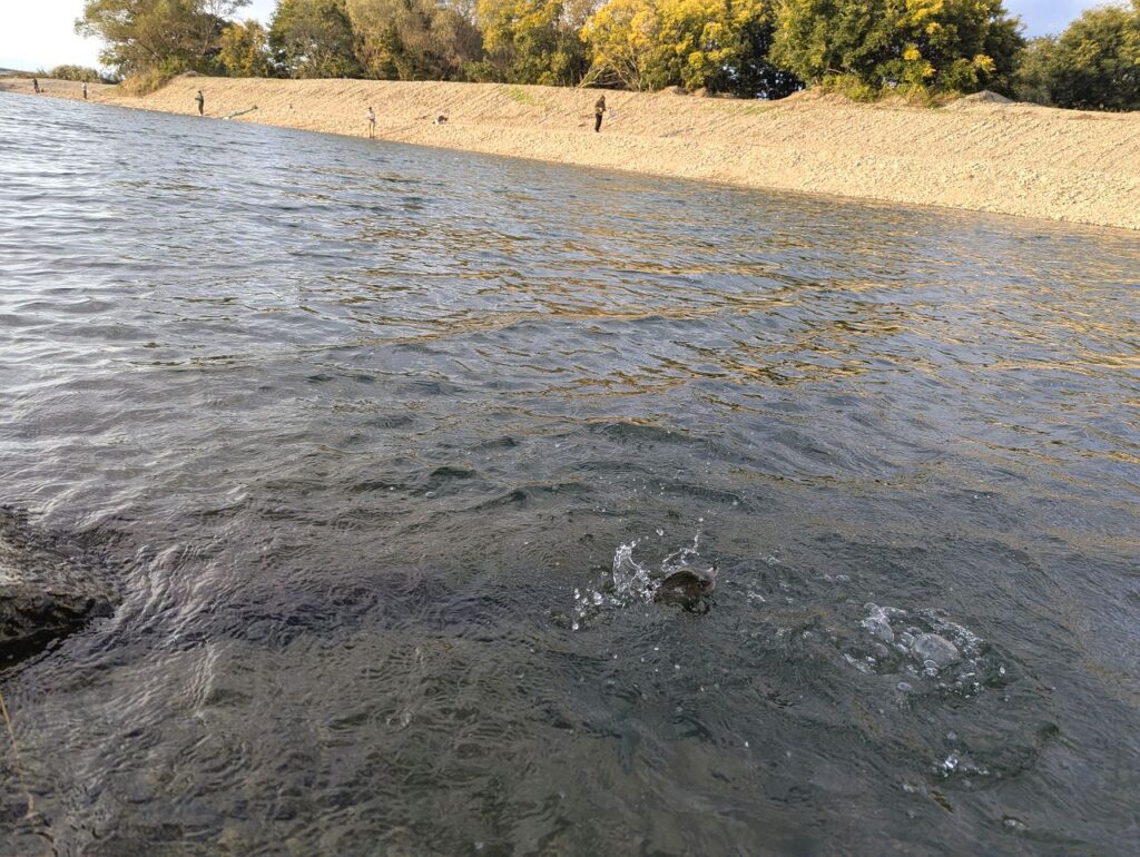 手前に群れていた今日放流されたであろうマスの群れがいたので、ボトムをツンツンすると食ってきました。