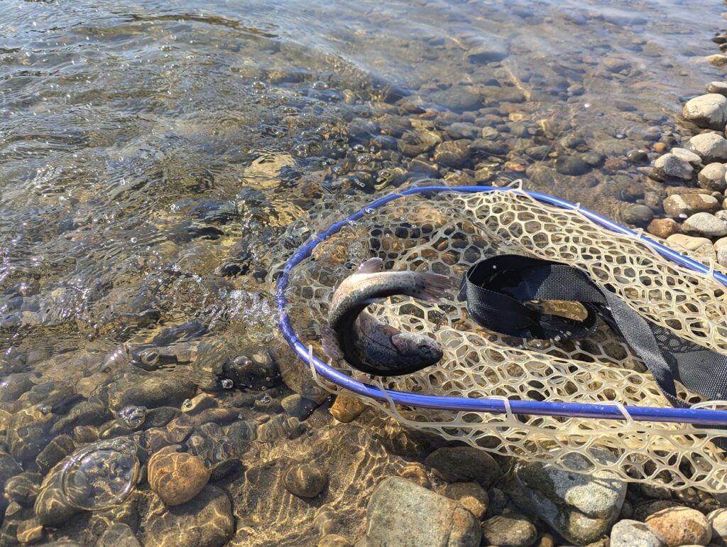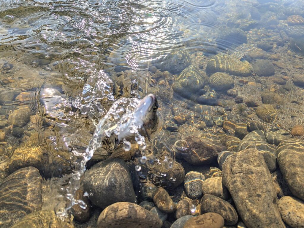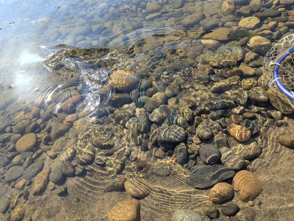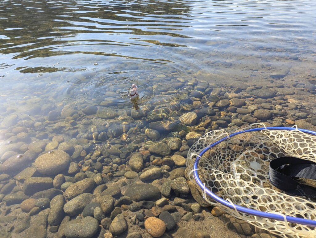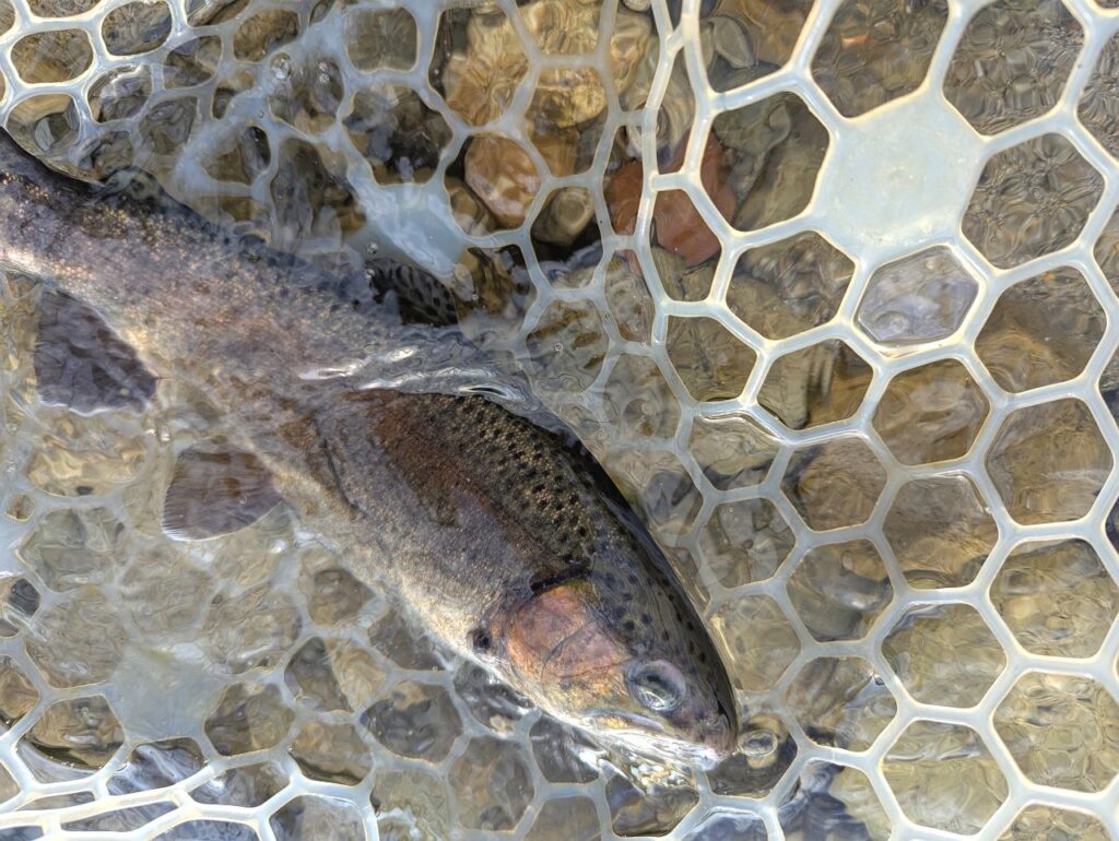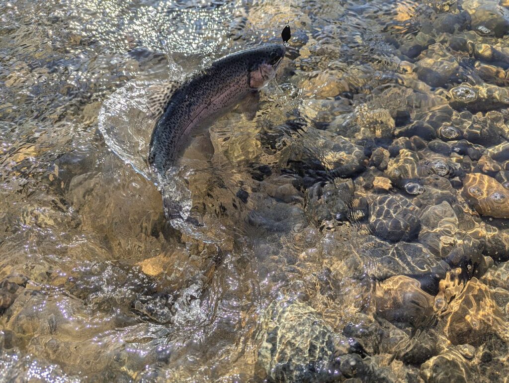 手前に群れていた今日放流されたであろうマスの群れがいたので、ボトムをツンツンすると食ってきました。